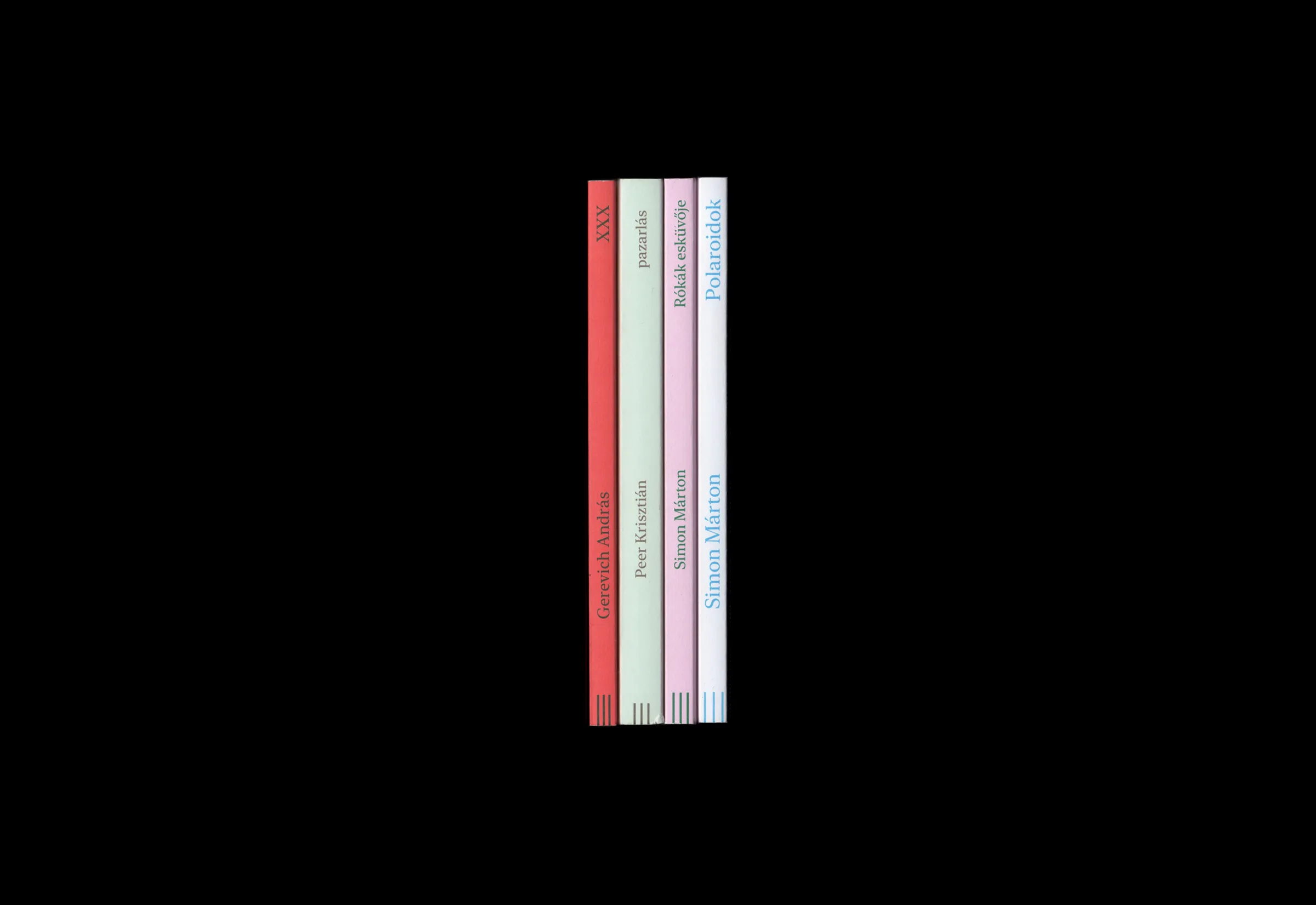 Kozma Dániel → A sorozat borítói változatosak, a tervezői hozzáállásban mégis érezhető az összetartozás. Minden kötet borítója egyedi és érezhetően a tartalomhoz tervezett, mégis összeáll a sorozat arculata. A tipográfiára, színekre és néhány grafikai gesztusra redukált eszköztár erős atmoszférát teremt, mégis nyitva hagyja az értelmezést.
