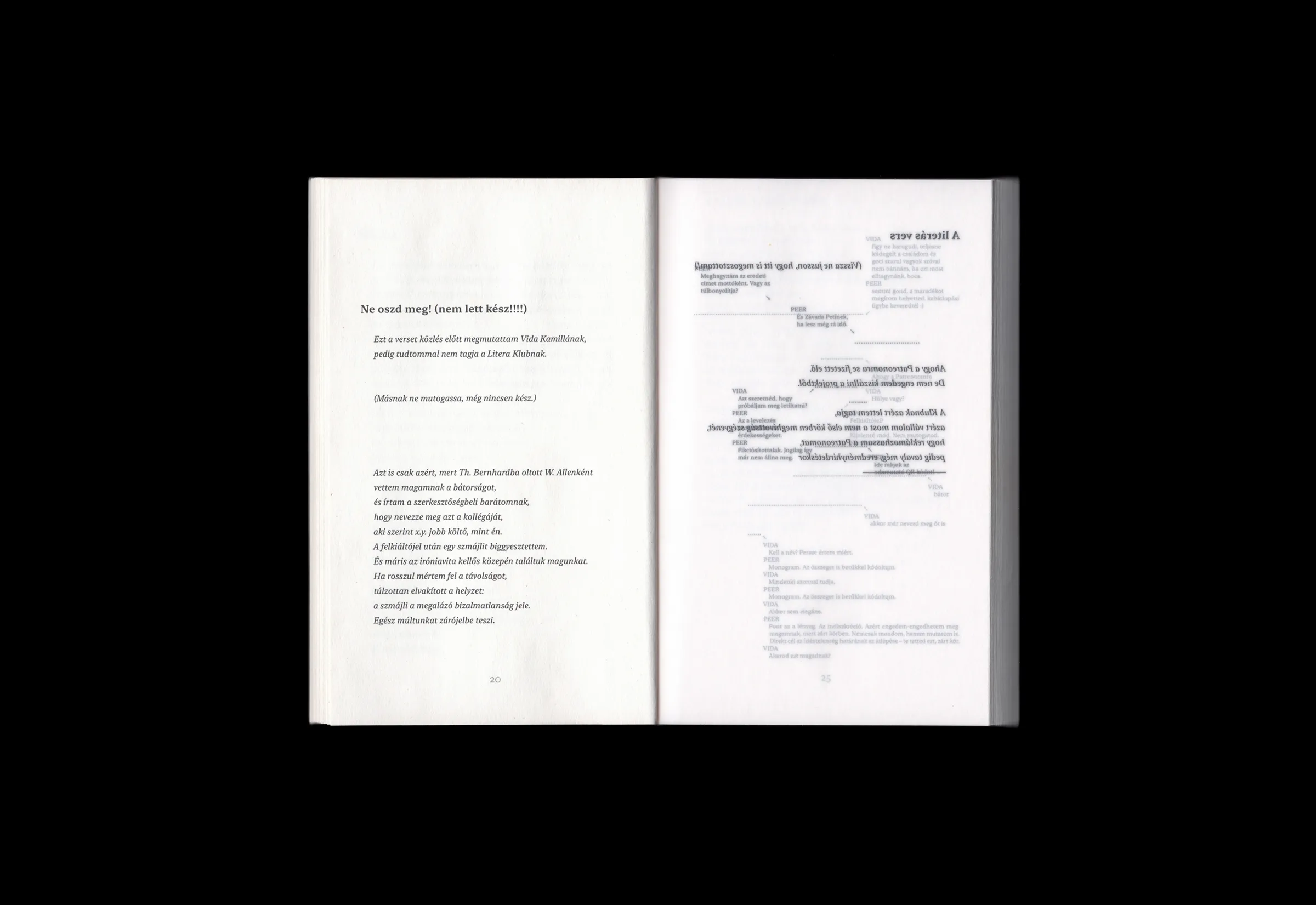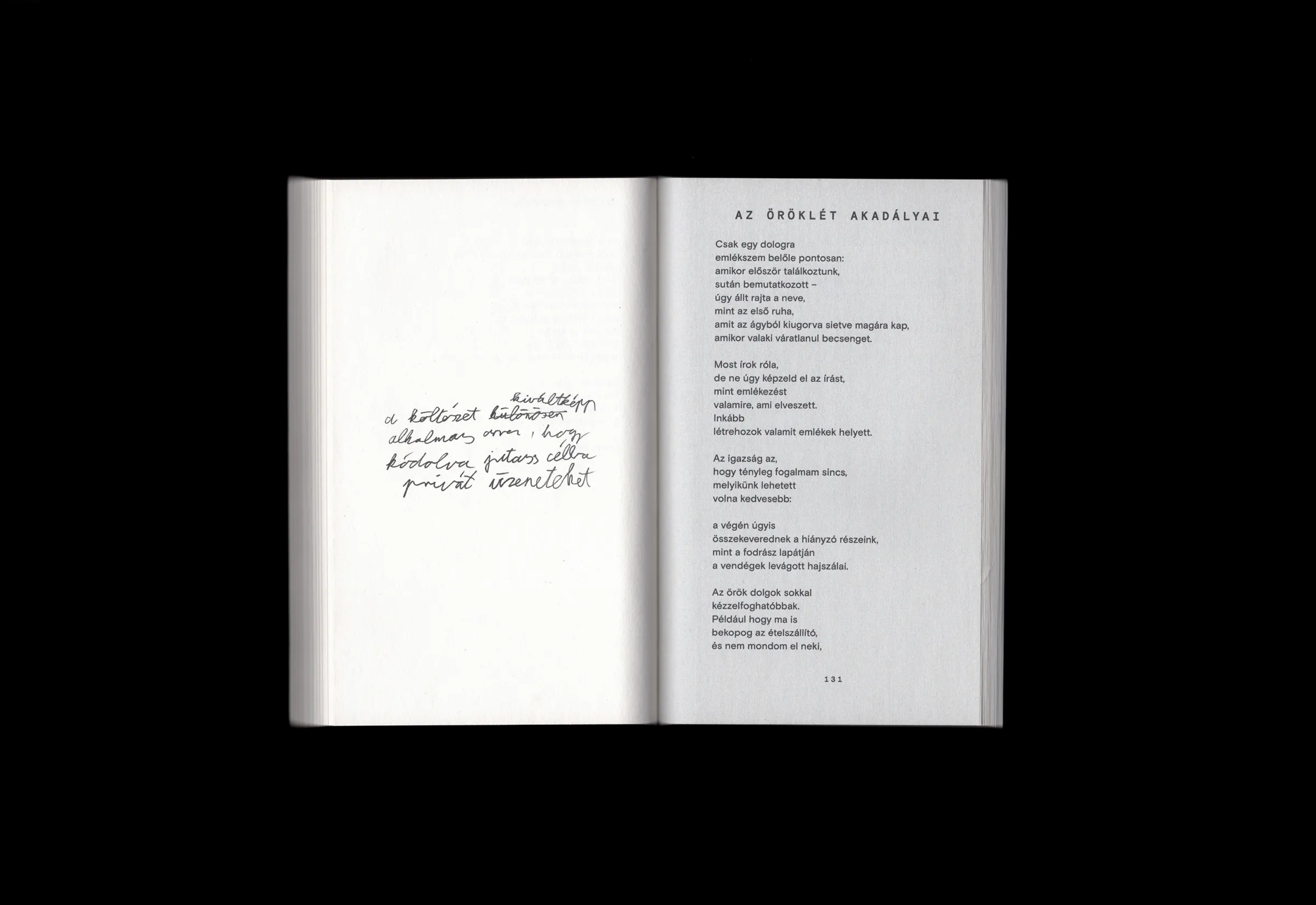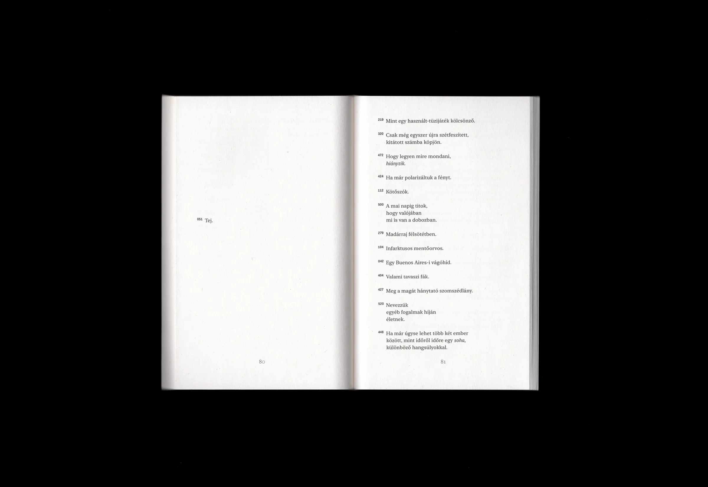 Bakos Katalin → Mikor kézbe vettem a verseskönyveket, az első érzésem az volt, igen, ilyennek kell lennie a kortárs líra könyveinek: kézreállónak, szeszélyesnek, valami személyesnek. Tetszenek a jelszerű, rendkívül egyszerű, a tartalommal adekvát címlapok. A szinte már szemtelen kötésforma a könyvecskék karakterének meghatározó eleme, ilyen gerincet eddig csak az írószerboltok kartonfedelű, „praktikus” írótömbjein láttam. A különböző hosszúságú, lebegő verssorok csak látszólag futnak szabadon a vékony, finom papíron, valójában a tipográfus láthatatlan szabályainak engedelmeskednek. A cizellált belső jóleső kontrasztban áll a „füzet” formával.