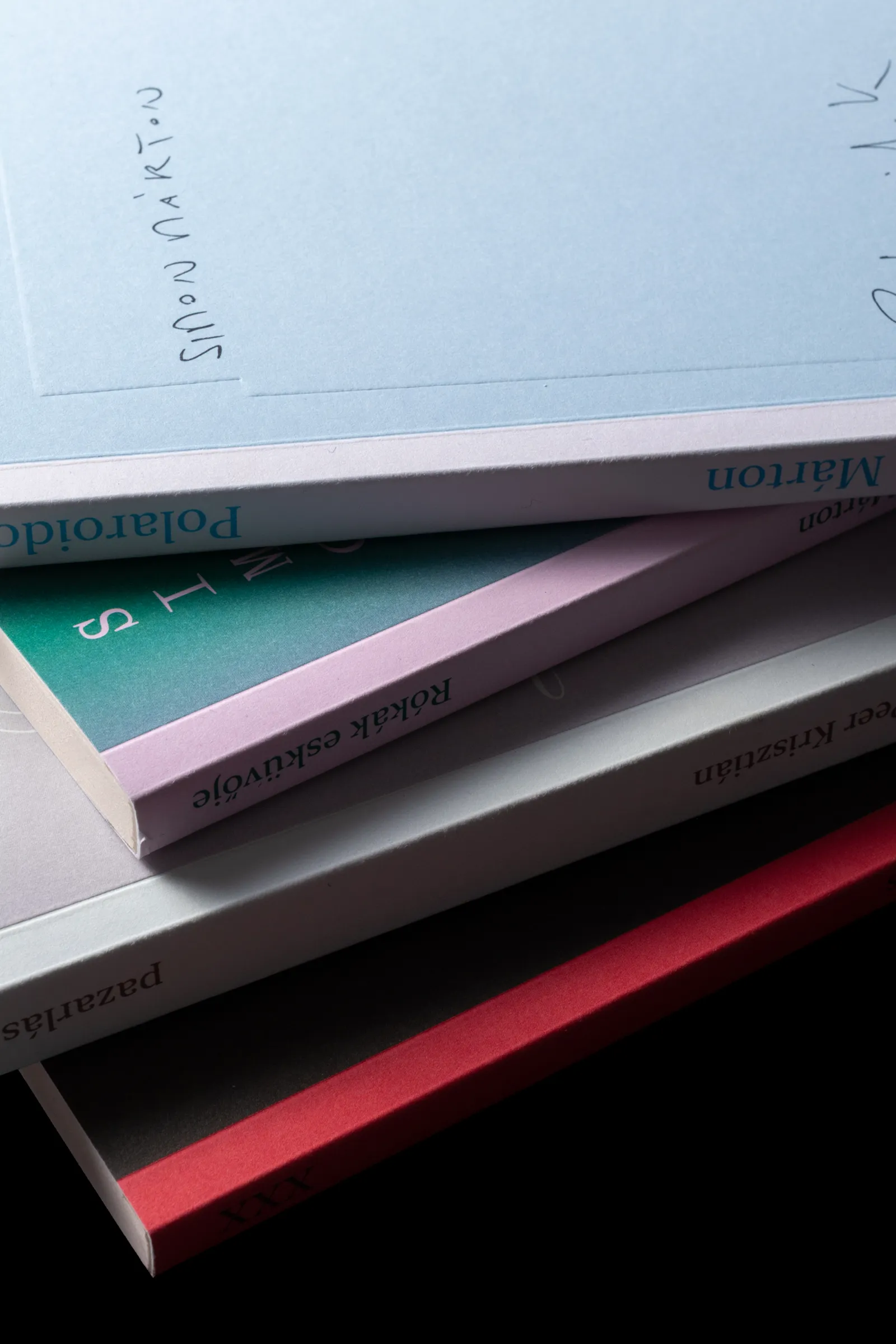 Hurrikan Press → Kabát belső zsebébe, farzsebbe, párna alá való könyvek: a kis verseskötet bensőséges formátum, amit Visnyai remekül ért. Érződik a kiadó és a tervező közötti jó viszony és bizalom. Ez a sorozat jó példa arra, hogy a legegyszerűbb alapanyagokból is milyen szép könyveket lehet készíteni, és egy-egy apró ötlet milyen jól tudja támogatni a verseskötetek hangulatát. Személyes kedvenceink a Peer Krisztián és a Gerevich András kötet. Legyen még sok ilyen!
